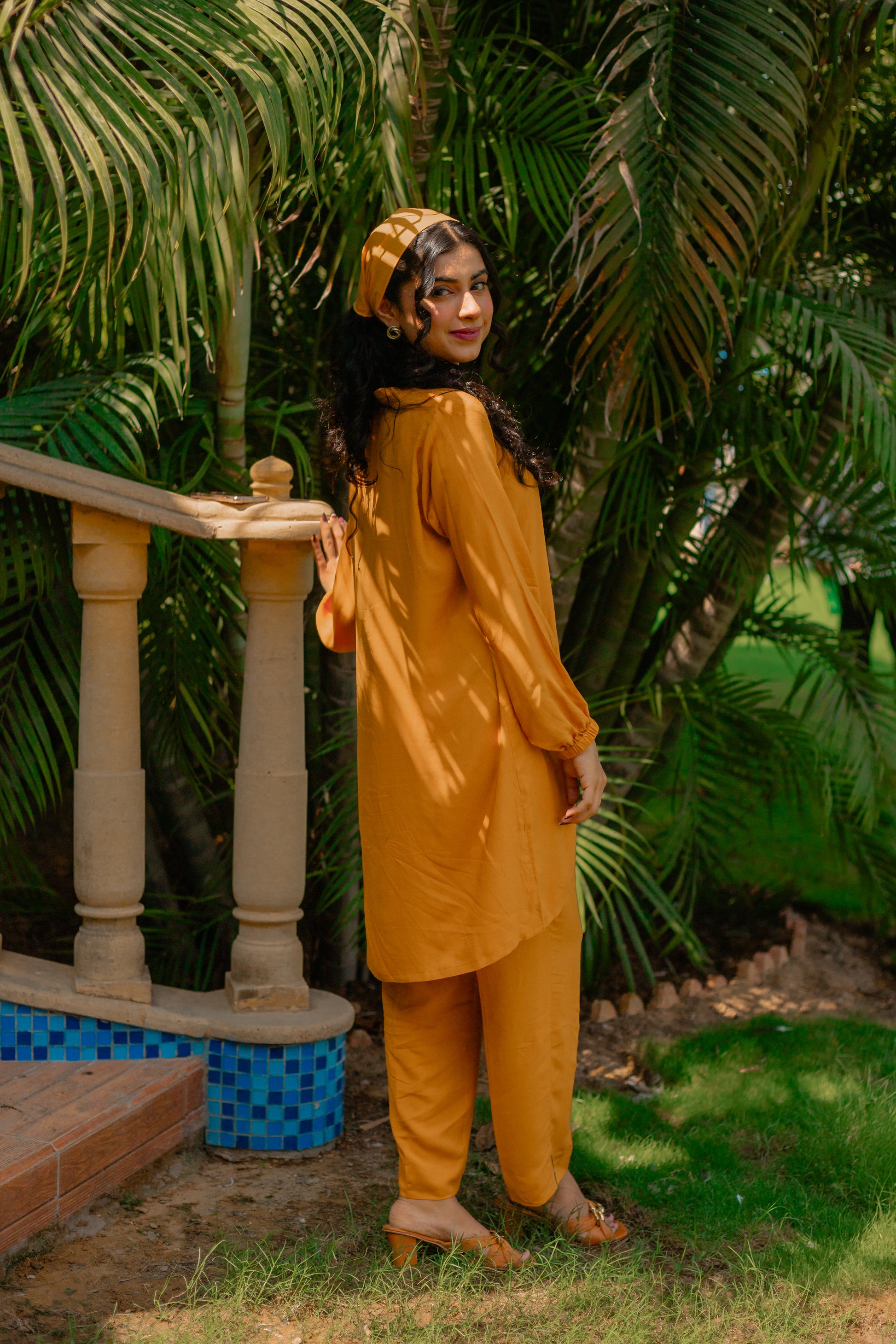 Minimalist mustard set with unique sleeve detailing and straight pants. Sleek, stylish, and perfect for any occasion.